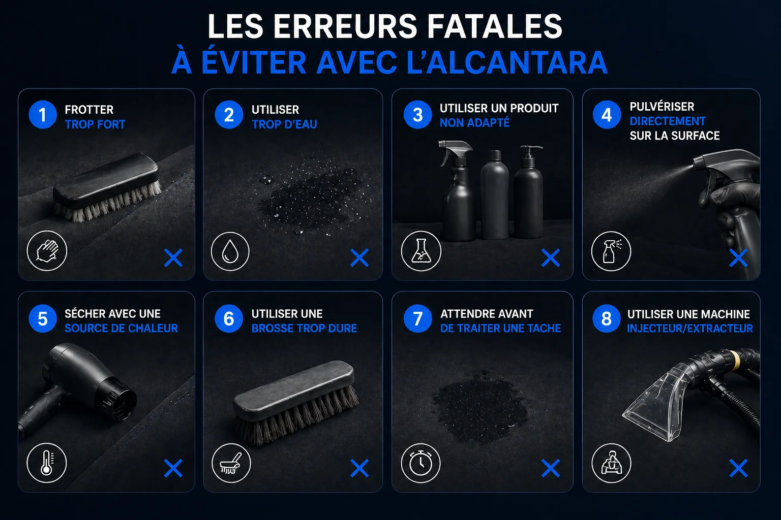 C’est souvent ici que tout se joue. Dans la majorité des cas, si l’Alcantara est abîmé, ce n’est pas à cause de la saleté, mais des mauvaises méthodes de nettoyage.